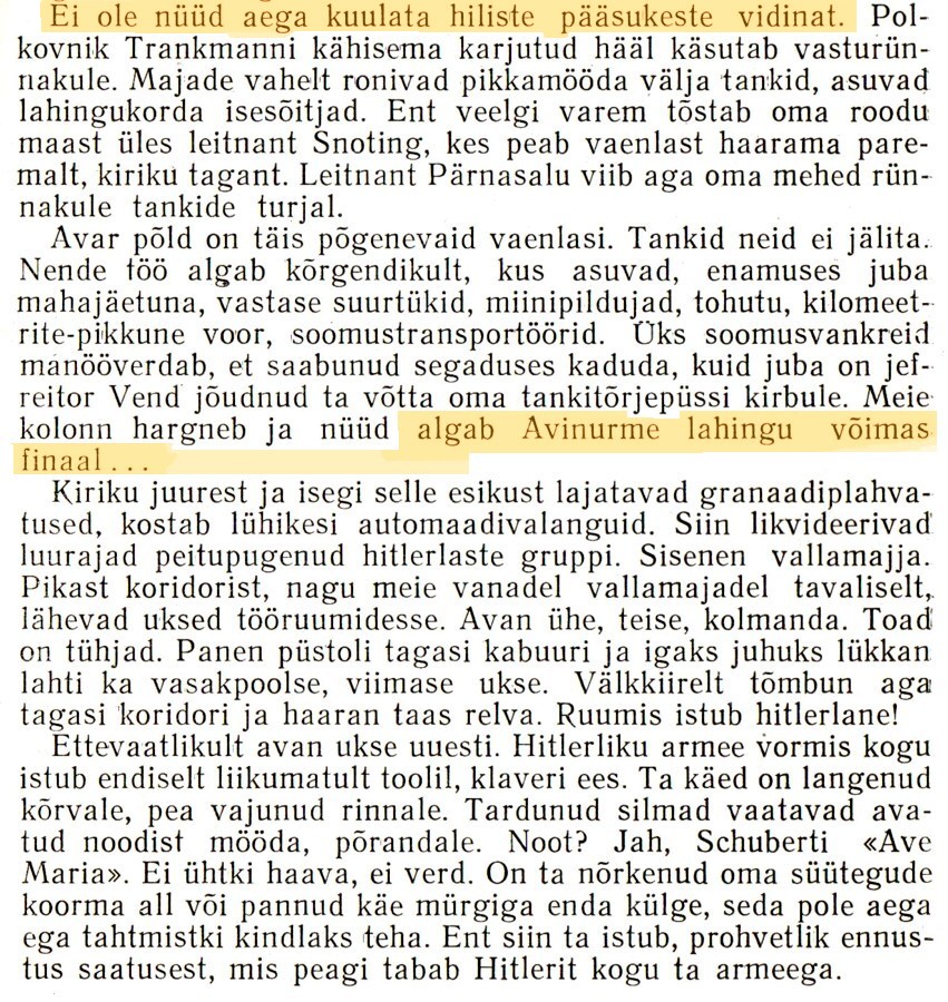 Tegelikult ei saa lahinguid üldse kergeteks ja rasketeks jagadagi. Kõik lahingud, nii väiksemad kui suuremad, on ühtviisi rasked. Lahinguid võiks tinglikult reastada tulemuste järgi. Nii nimetan meie polgu Eestimaa lahingutest kolme: Emajõe ületamist, Avinurmet ja Kuressaaret. Eriline koht neist oli Avinurmel, nii puht lahinguliselt tulemustelt kui sõjaliselt tähtsuselt. Lahing toimus 20 septembril 1944, sel päeval purustas meie s.t. üks polk kolm vaenlase jalaväe- ja suurtüki polku. Need olid 19. septembril taandumisplaani „Aster“ järgi Narva alt tagasi tõmmatud Saksa väed, kes kottijäämise vältimiseks liikusid esiotsa üsnagi takistamata lõuna poole. Meie teene oli selles, et hulk elavjõudu ja tehnikat ei jõudnud lõunapoolsetele väegrupeeringutele appi minna.