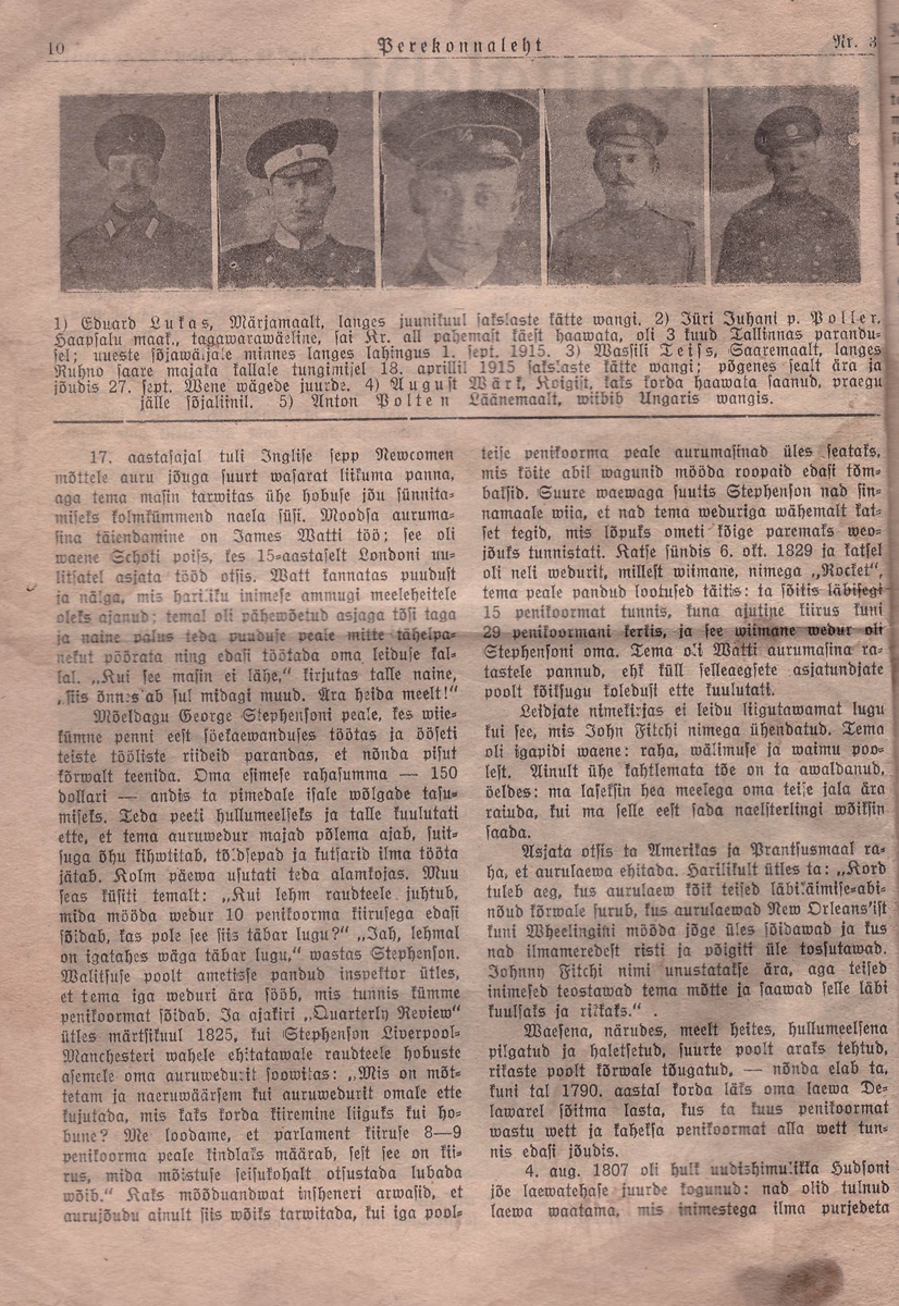 Kuni 1915. a. oli Perekonnaleht ka Päevalehe lisa (tiitel ongi Päevalehe, Aja ja Koidu hinnata kaasaanne. Lõin huvi pärast paar nr lahti (1915. a. jaanuar). Seal ka sõjameeste pilte. Nii haavata saanuid, muidu silmapaistnuid, kui ka lahingute ajal kaduma läinuid ning langenuid. 9. ja 16. jaanuari nr-tes on koguni kiri saksa sõjavangist koos saadetud fotodega.