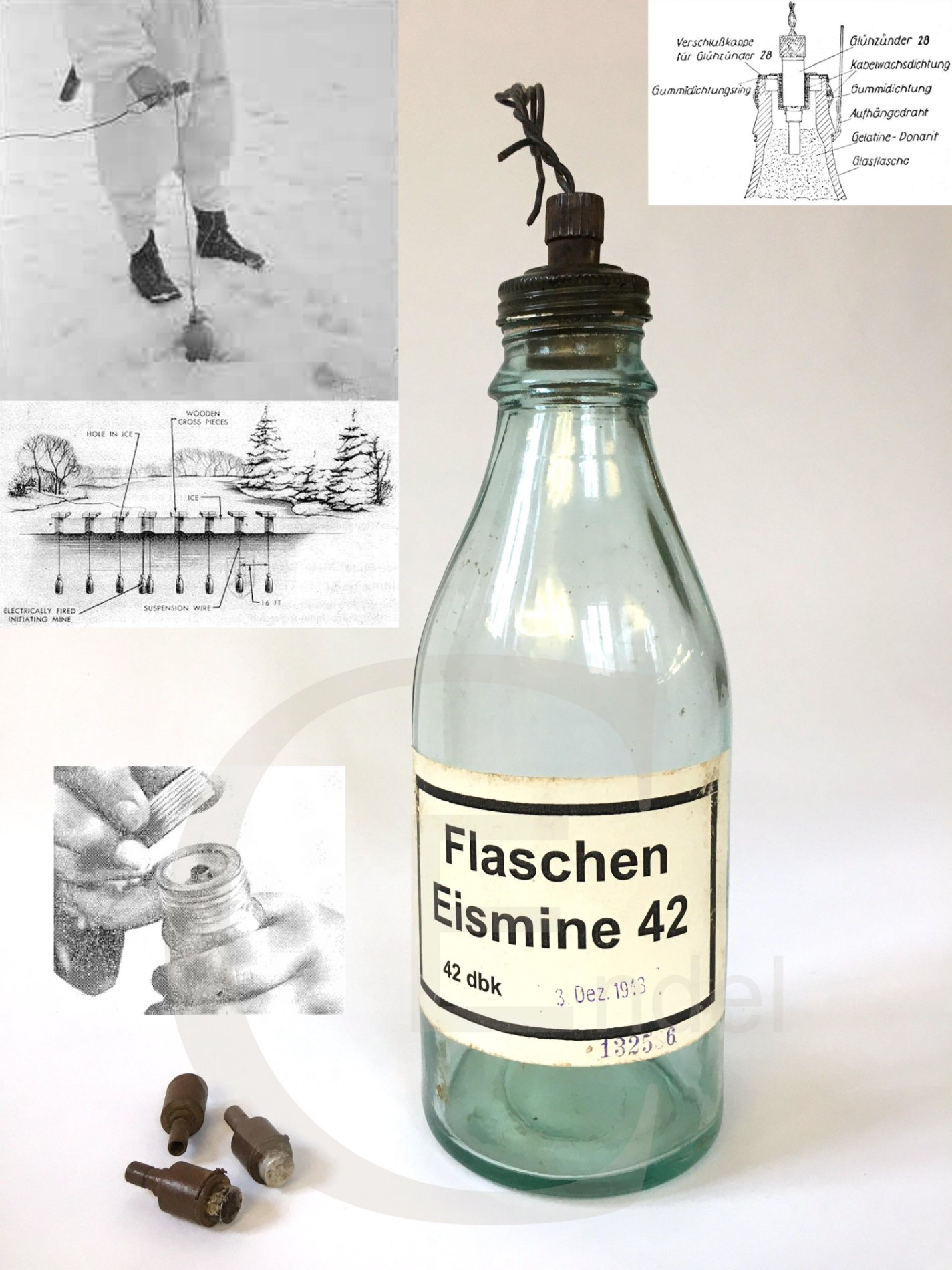 Pudelmiini kasutati mitmeotstarbeliselt. Sütiku variantidest sai paigaldada spetsiaalse survesütiku Fl.Es.Mi.Z (nätav pildil), mis minu hinnangul on suhteliselt ebaefektiivne. Jää õhkimiseks kasutati elektrilist sütikut Glühzünder38 (nähtav pudeli küljes) ning juhendi järgi paigaldati pudelid ca viie meetriste vahega ja ca kahe meetri sügavusele jää alla, mis ajastatult õhiti. Lisaks kasutati jalaväevastase maamiinina, sest vaheadapter võimaldab erinevate saksa surve- ja tõmbesütikute paigaldamist.