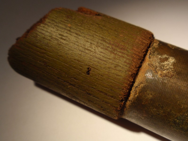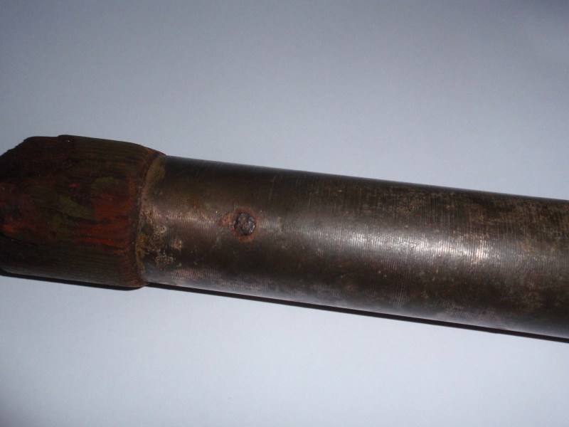 Tuli välja Saaremaalt Sõrve poolsaarelt prügihunnikust koos muu militaarse pudi-padiga.Seetõttu on alust arvata,et ka antud inventar on militaarjäänuk? Militaarsele päritolule viitab ka puitosa värv.Kaigas on puidust ja messingust / pronksist käepideme ümbrisega.Ainus markeering,mis olen leidnud on nr 8 puitosal aga äkki on see sinna juhuslikult tekkinud kriimustuse näol.Pikkus ca 15 cm ja kaal tänu messingule ca 1 kg või rohkemgi.Jämmust käepidemel 3,5 cm ja ülevalt 4 cm.Messing on justkui kinni needitud puu külge.