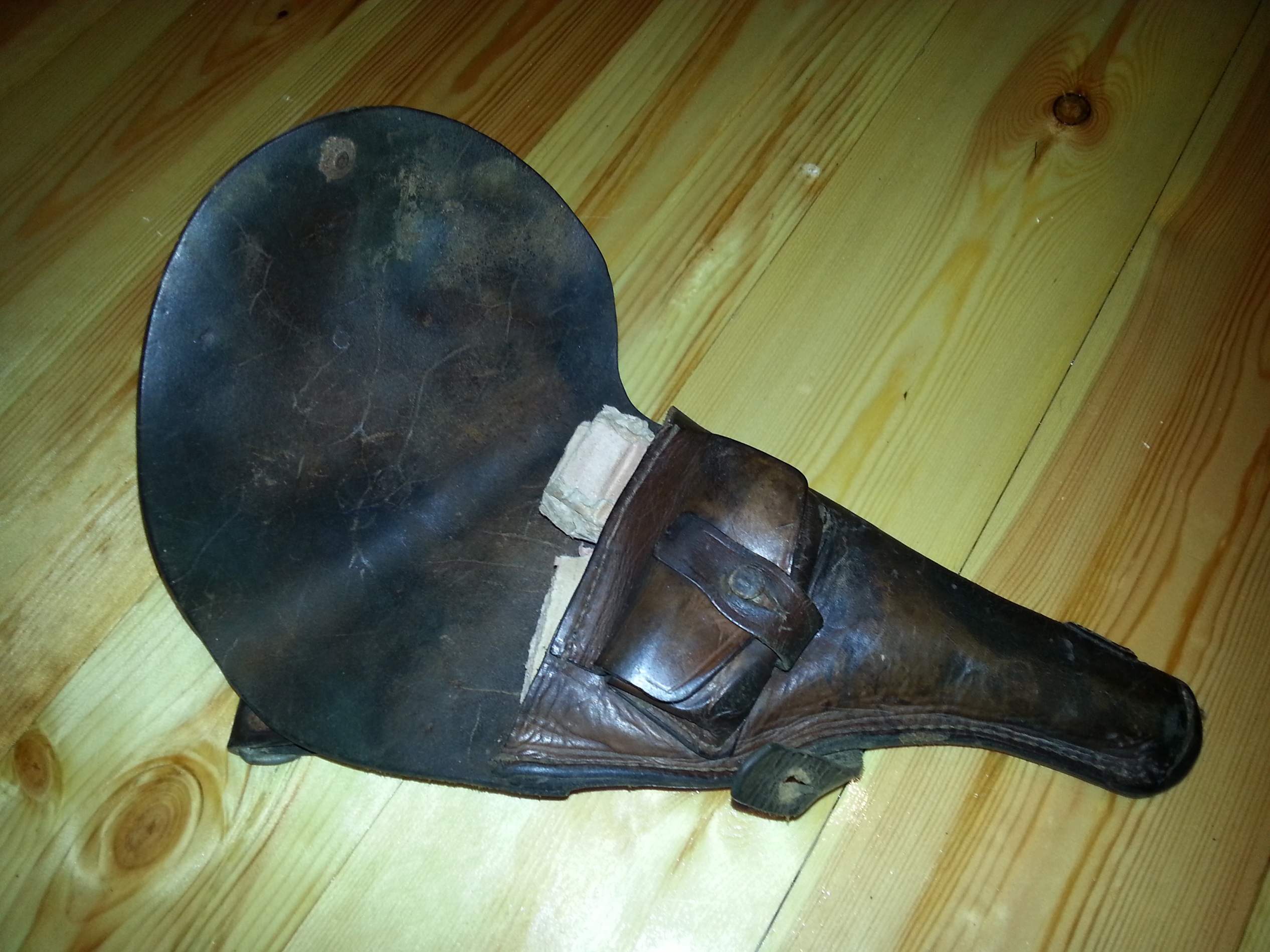 Lisaks on üle veel üks nagaani kabuur, tegumoelt sõjaeelne aga templit klapilt ei tuvasta. Nahk on pehme ja kannatab painutamist, needid aga rauast ja kehvas seisus ning puhastusvarda kinnituse aas tuleks uus õmmelda aga äkki passib kellegi kratile ilusti. Kui kellelgi huvi peaks olema, siis andke märku ja ma mõtlen talle miski väärtuse või veel parem, vahetame millegi vastu.