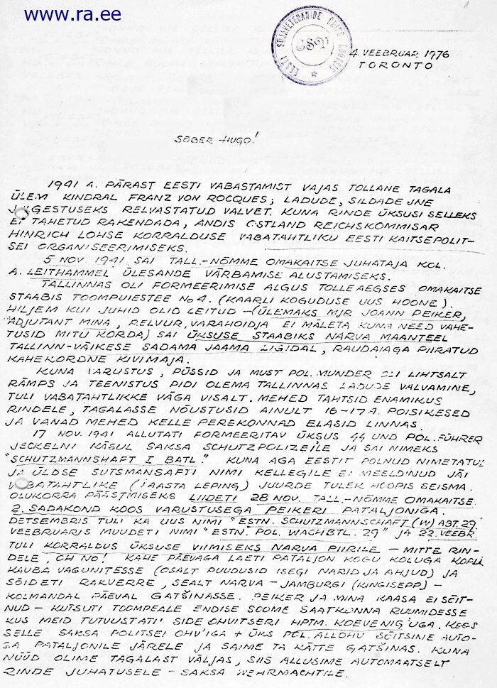 Üksuse loomisest kirjutab pataljoniülema adjutant Härm Kore oma 1976. aasta kirjas -