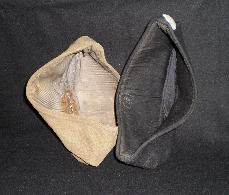 WH M43 välimüts millel trapets eest ära lõigatud. Õrn jälg näha. Pole näinud ega kuulnud, et siinmail trapetsiga SS-i oleks liikunud. Kuigi välistatud ei ole. Ees on tsenterõmbluses ja voodris auk sees ja on kantud klemmidega mütsimärki (EW KV mütsimärk, mõni EW kokard, kohaliku tööna valmistatud SS kolp..?)