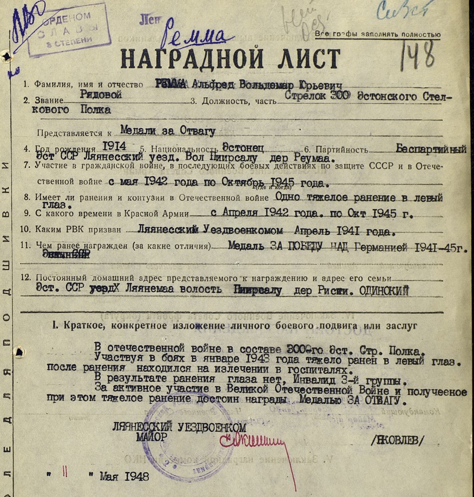 300. Laskurpolgu laskur Alfred Remma. Kuulsuse ordeni III järk (666739) ja Lahinguteenete medali kavaler. Autasud saadud haavatasaamise eest. Võttis osa Velikije- Luki lahingutest ja Jaanuaris 1943 ka rünnakust ''Valgele majale'' sai haavata ja jäi ühest silmast pimedaks...
