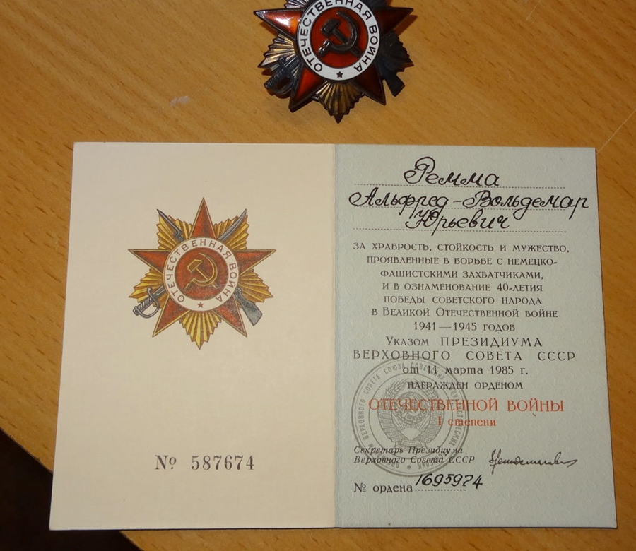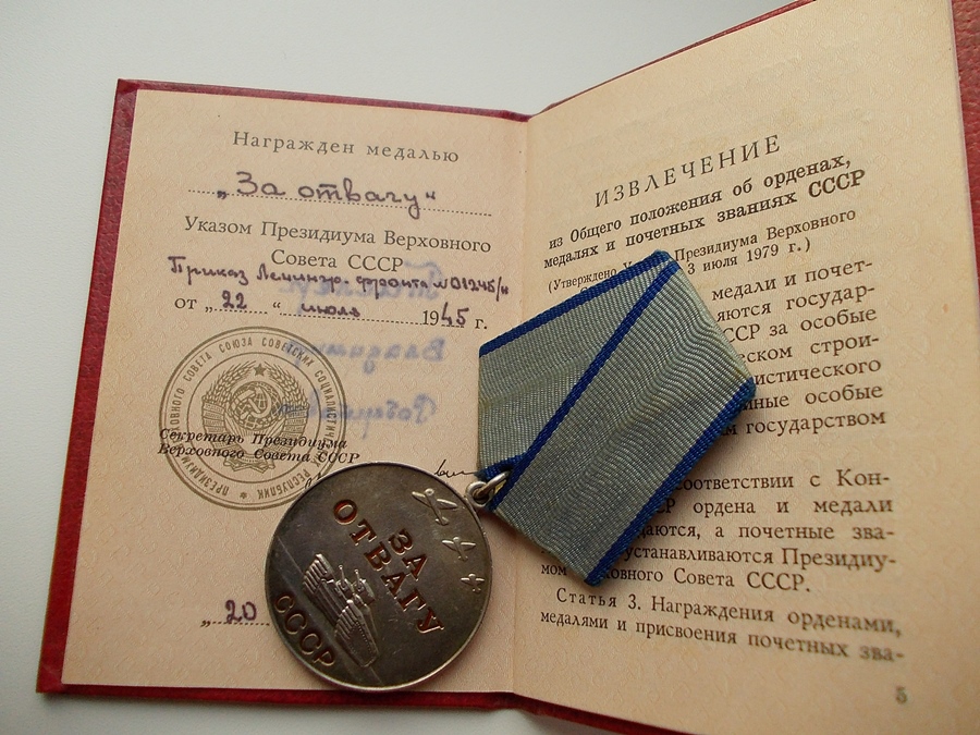 Ostast läbi käinud nooremseersant Vladimir Tisler'i Vapruse medal. 249. Laskurdiviis 921. Laskurpolk. Leningardi rinne- Duderhof- Narva- Saaremaa. Medal on saadud tagantjärele, ilmselt kaheksakümnendatel aastatel ja selle eest, et Tisler sai 1944. aastal raskelt haavata.