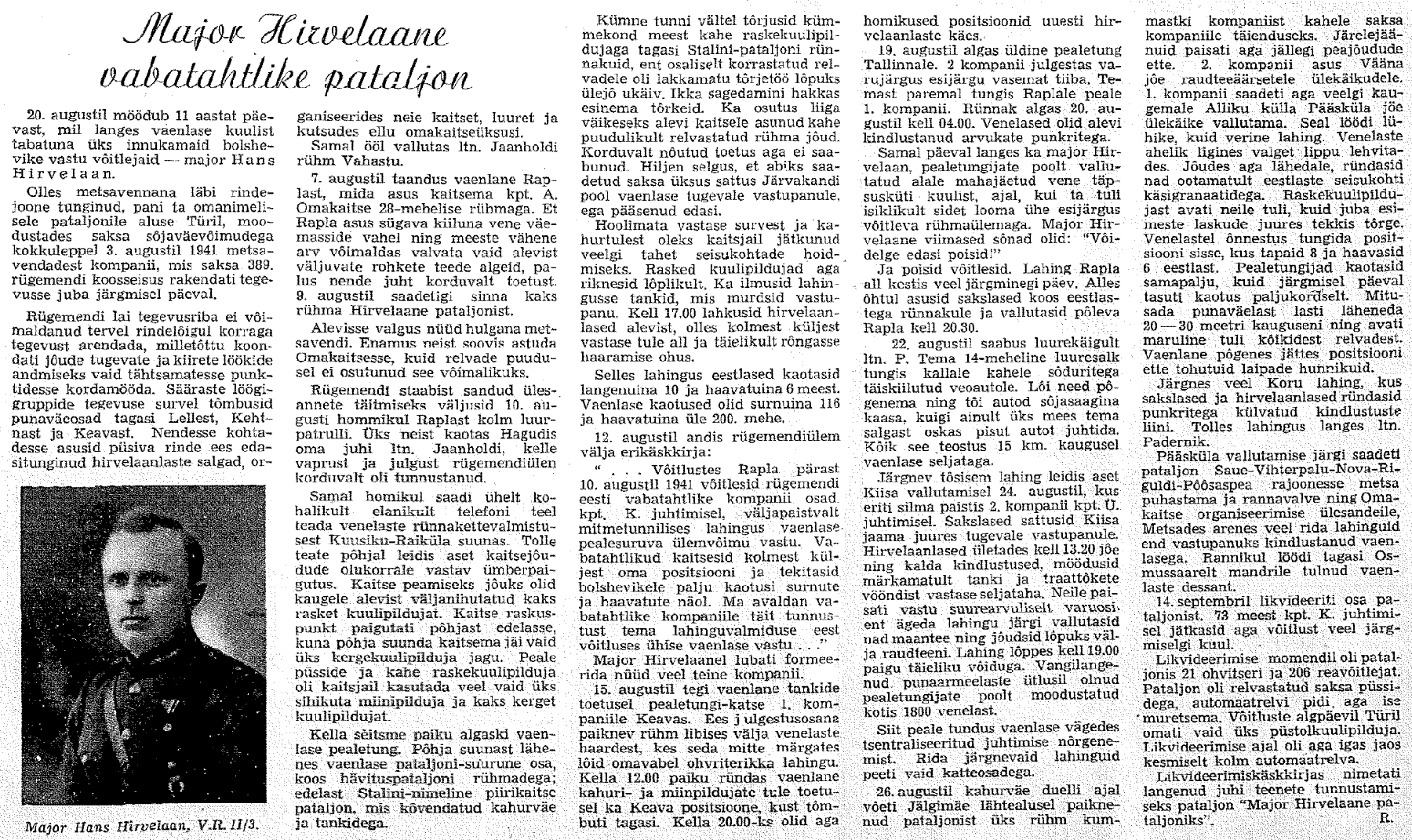 Mälestuste käsikiri Hirvelaane pataljonist leidub Riigiarhiivis ERA.4416.1.468 . 8 lk, kirjutatud 1942