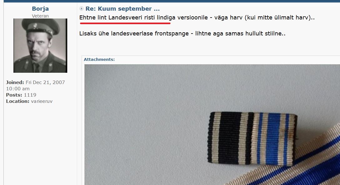 We, estonians, are calling all that v.d.Goltz/Bischoff/Fletcher shit simply as LANDESVEER..Venepoeg kirjutas:If you know - what is this?Borja kirjutas:Daa-daa, znaajem 4to baltiiski krest - ne takiije gluupõjeVenepoeg kirjutas:it isn't Landeswehr Cross ribbon, it is Baltic Cross ribbon. Not rare. Landeswehr Cross consist of two stripes - blue and white.![]()
