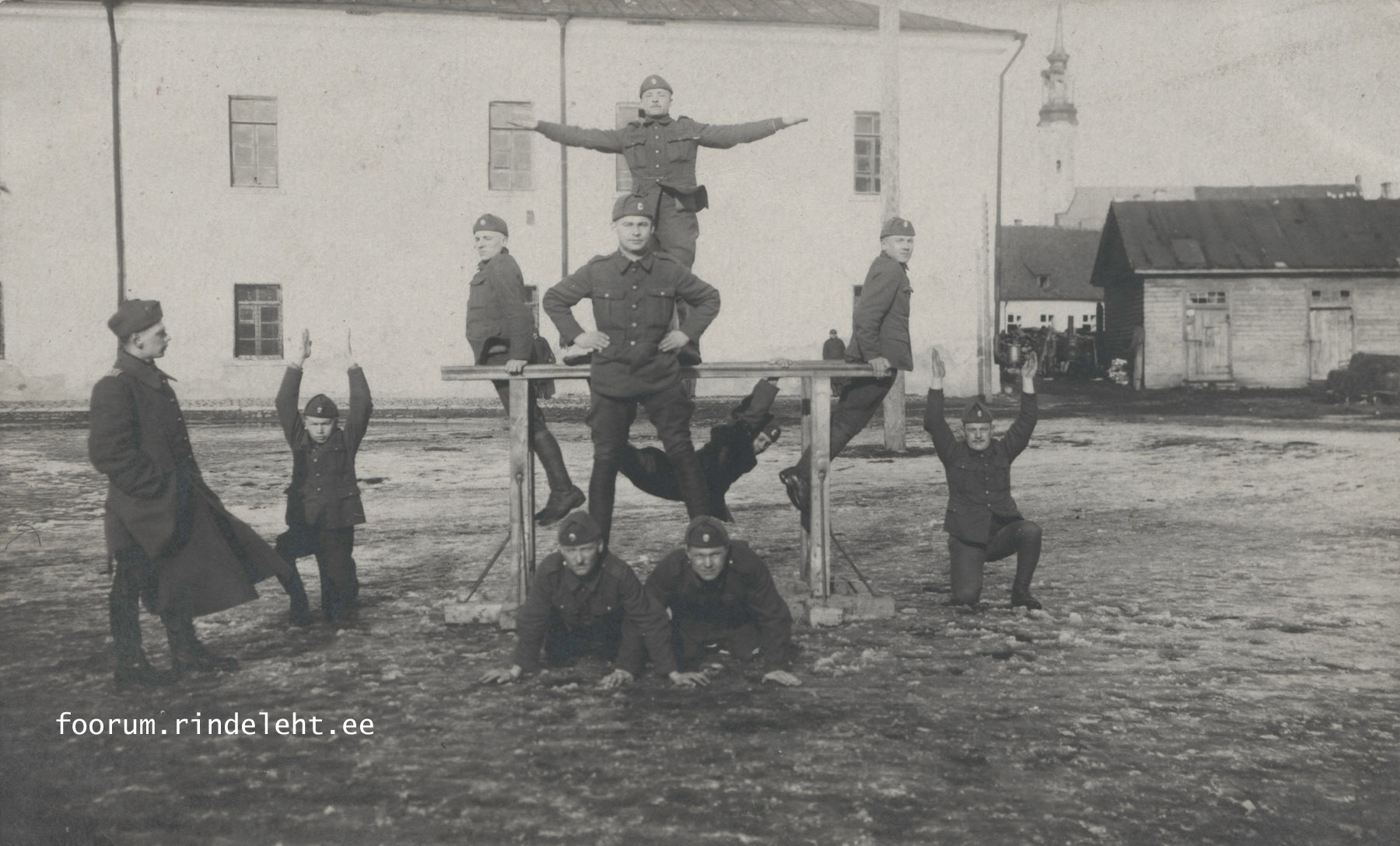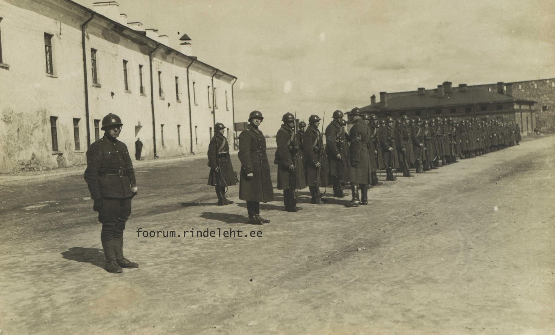 Pildistatud 1920. aastate alguses Hermanni kindluse hoovil valge hoone ees, taustal paistab Jaani kiriku torn.