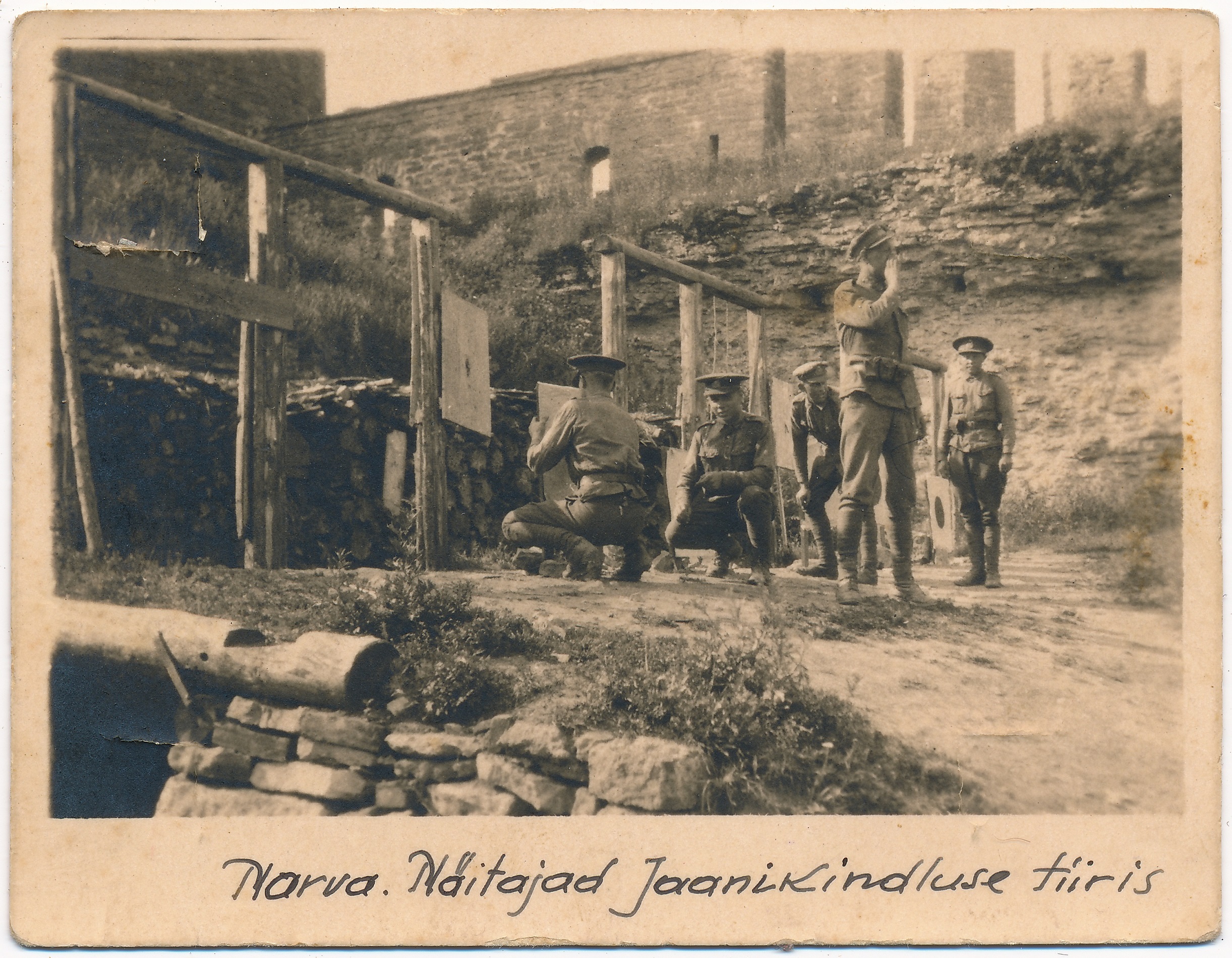 Ülesvõttel oleval sõduril on rinnas 1. jalaväerügemendi XXXIV reservallohvitseride kursuse rinnamärk.