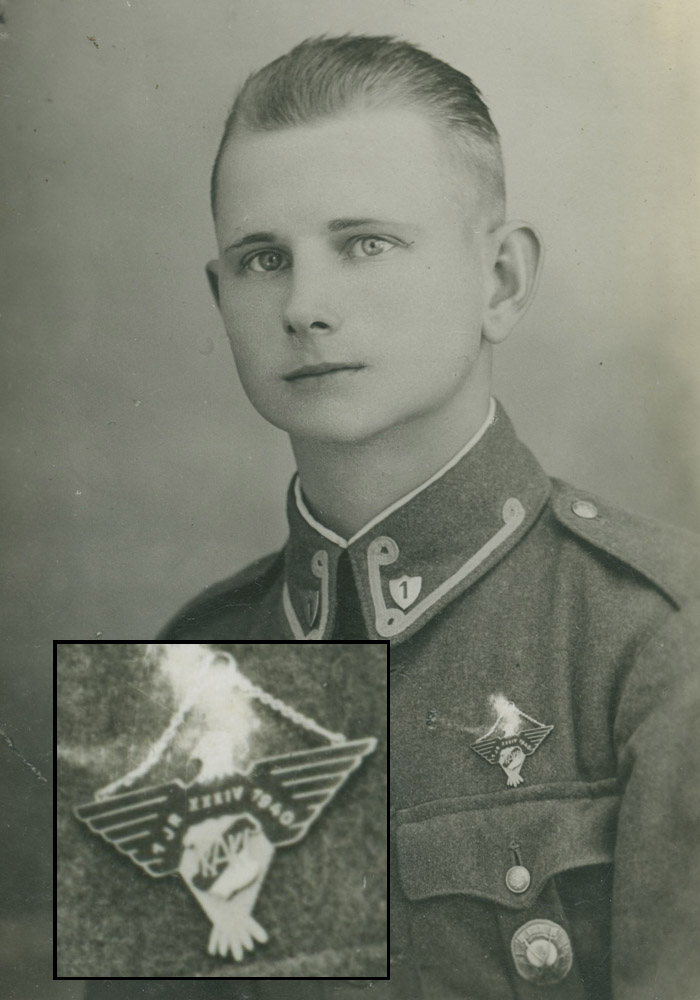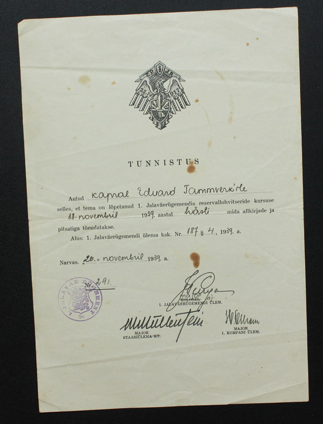 1939. aastal välja antud 1. jalaväerügemendi reservallohvitseride kursuse tunnistus ja 1940. aasta kursuse rinnamärk.