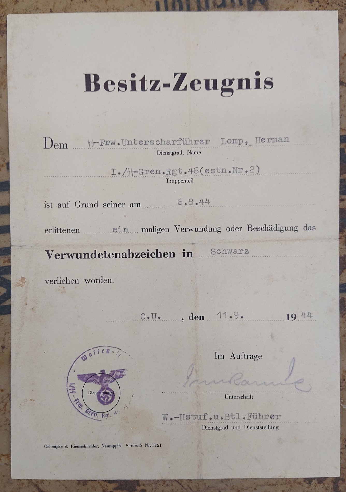 20. ED 46. rügemendi I pataljoni Unterscharführer Herman Lomp'i palgaraamat ja musta haavatumärgi tunnistus.