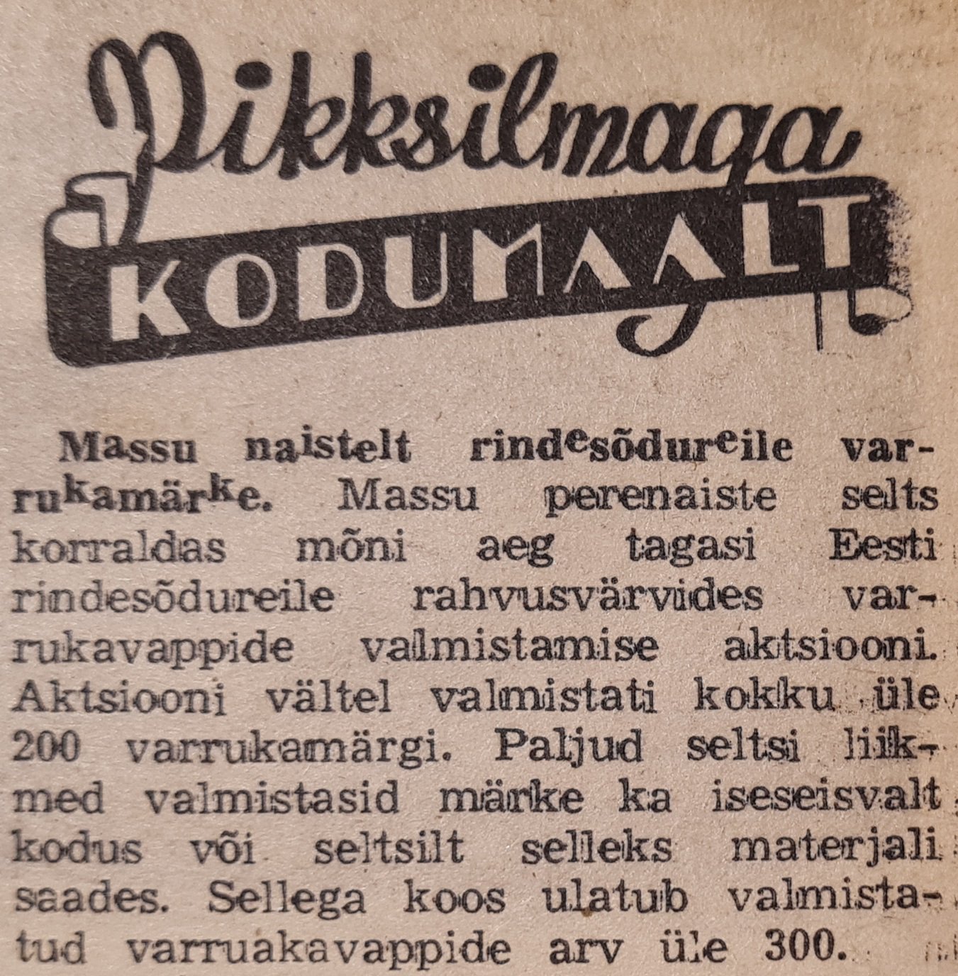 Uudisnupuke ühest "Rindelehe" numbrist - "Massu naistelt rindesõdureile varrukamärke".