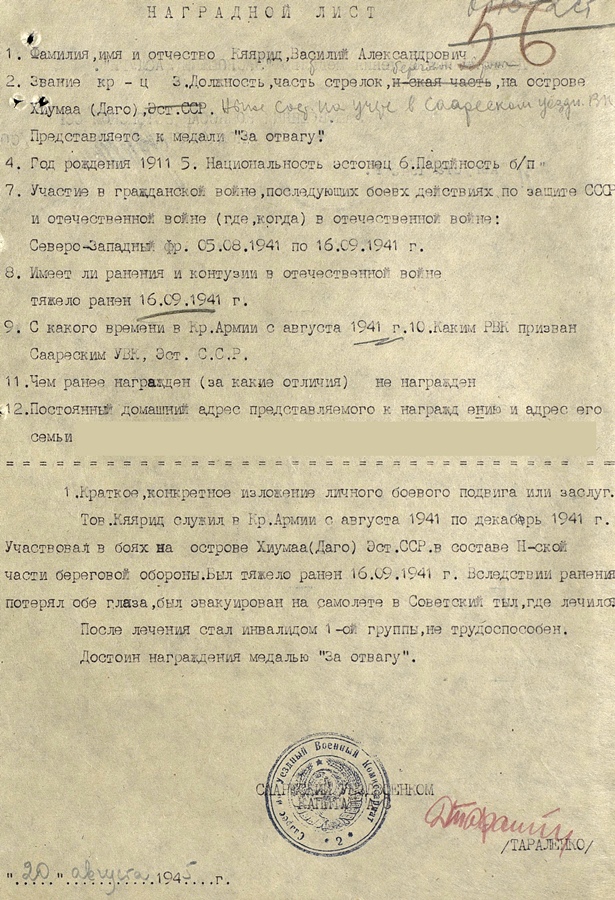 Laskur Käärid võttis punaarmee rannakaitseüksuse koosseisus osa Hiiumaa kaitsmisest ja seda 1941. aastal. 16.09.1941 sai Hiiumaal raskelt haavata ja jäi pimedaks...