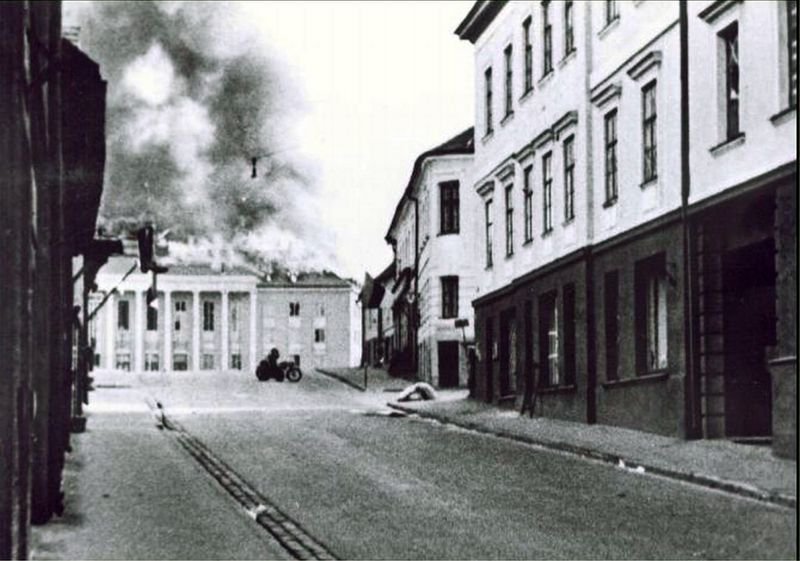 Tartu Kaitseliidu maja põlemine 12. juuli õhtul 1941. Lipud taas trikoloorid, tsiklist vist fašist?