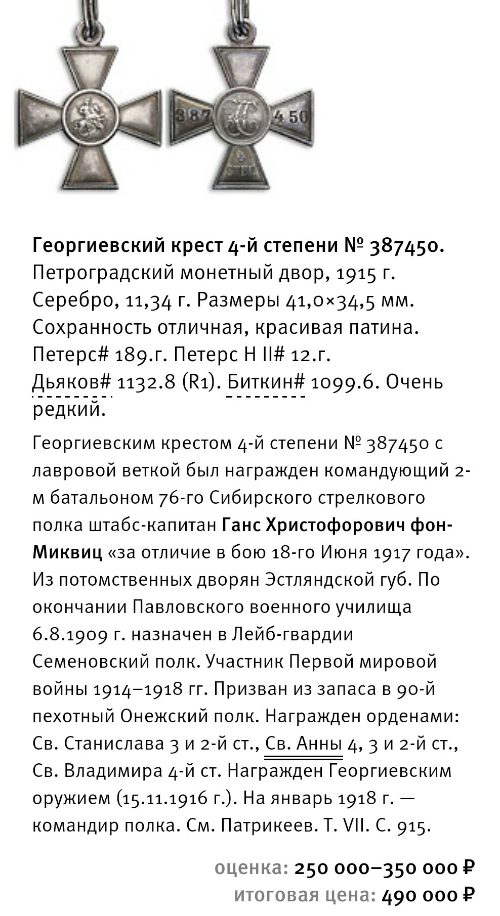 449. Hans von Mickwitz - Georgi risti IV (387450) järk loorberioksaga