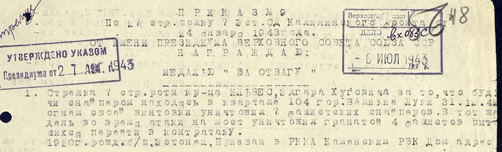 tossom kirjutas:..kus oma vintpüssist hävitas 31.12.1942 7 vaenlase snaiprit. .
