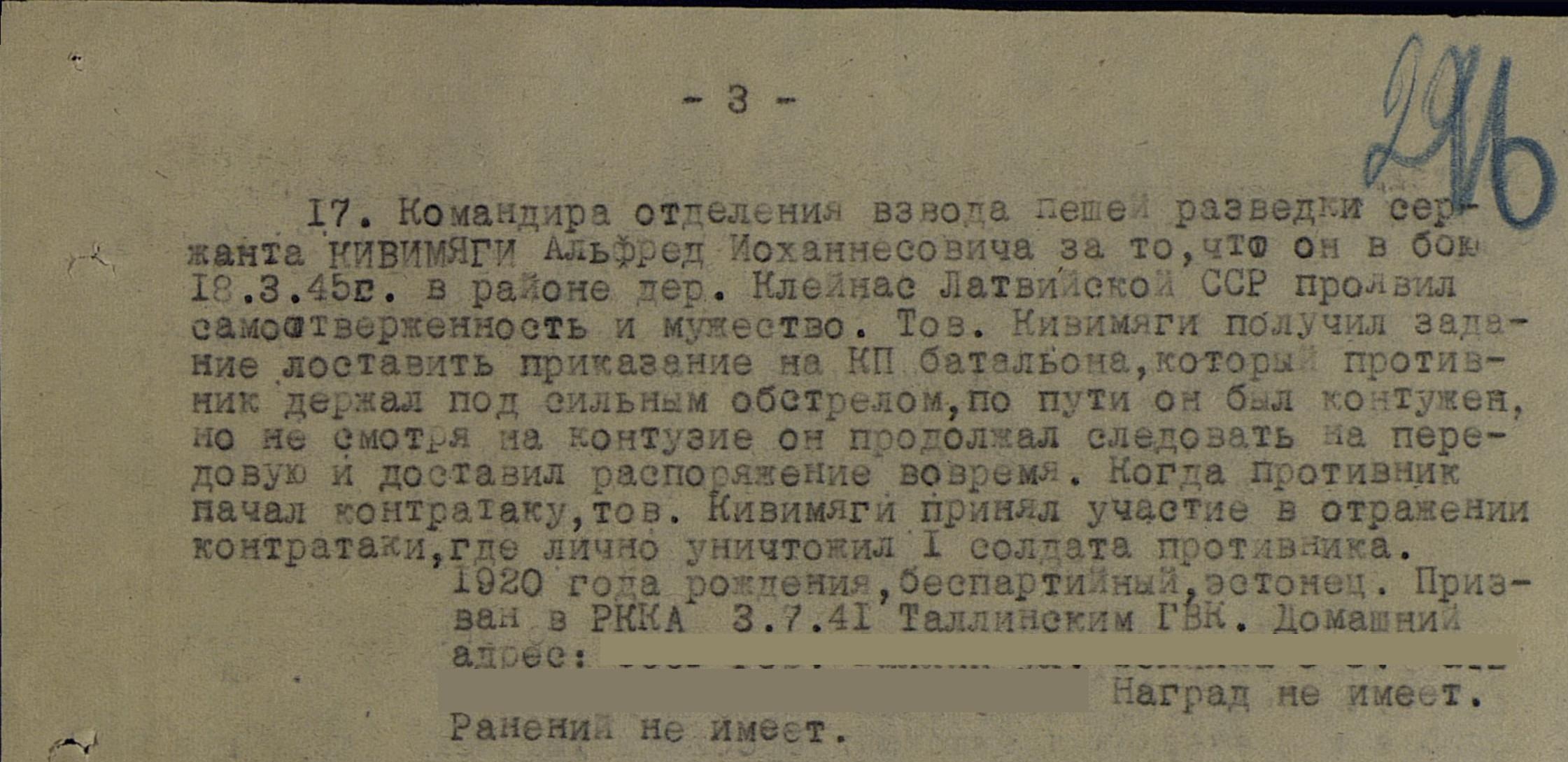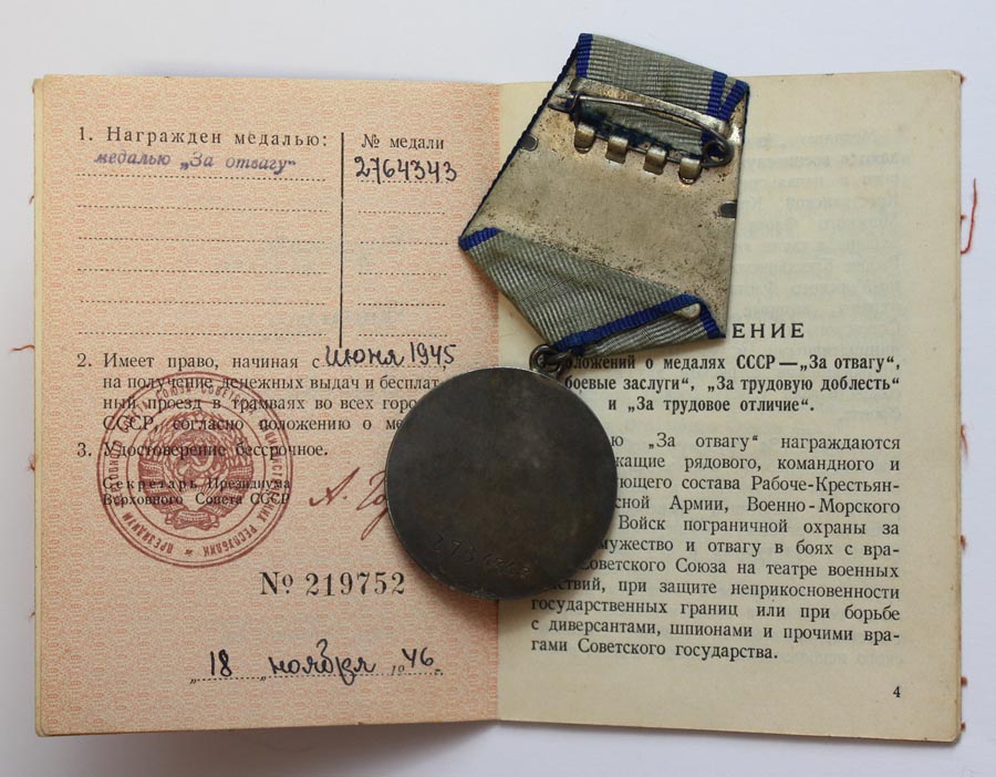 "Za otvagu" nr 2 764... ja "Za bojevõje zaslugi" on numbrita. "Võit Saksamaa üle" medali dokument on allkirjastatud polgukomandör Ilmar Pauli poolt.