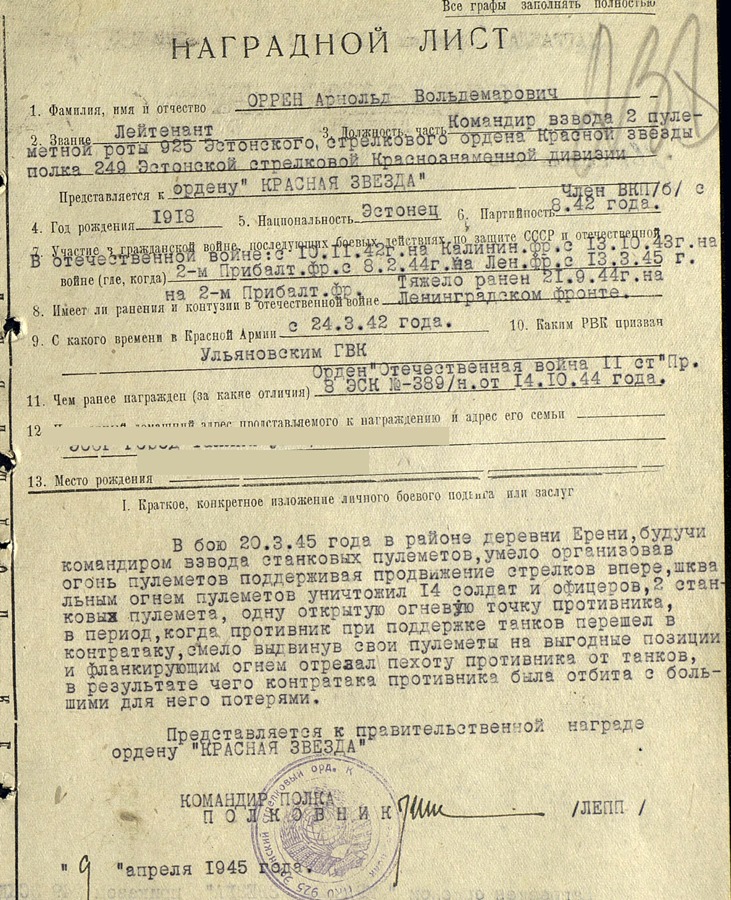 249. Laskurdiviisi 925. Laskurpolgu 2. kuulipildujate roodu jaokomandör Arnold Orren. Ilma numbrita Lahinguteenete medal on saadud Punaarmees väljateenitud aastate eest. Punatäht saadud Kuramaal Ereni küla juures, Isamaasõja II klassi orden aga Septembris 1944. Udeküla ( kui nüüd õieti välja loen, selline koht on Tamsalu kandis ) juures, kus jäi oma jaoga vaenlase piiramisrõngasse. Avas isiklikult vaenlase pihta tule kuulipildujast, mille meeskond oli rivist välja löödud. Sai küll rinda haavata, kuid ei lahkunud kuulipilduja juurest ennem, kuni lõppes laskemoon. Selle tulevahetuse tulemusena sai rood vaenlase piiramisrõngast välja murda.