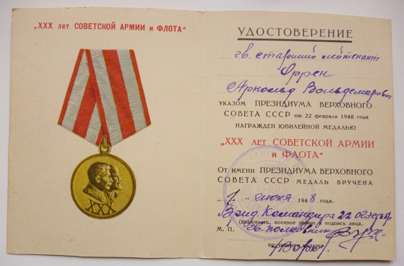 Huvitav on medali XXX aastat N. Armeed ja laevastikku medali dokument mis kannab 22. Kaardiväe Eesti Üksikus Laskurbrigaadi templit.