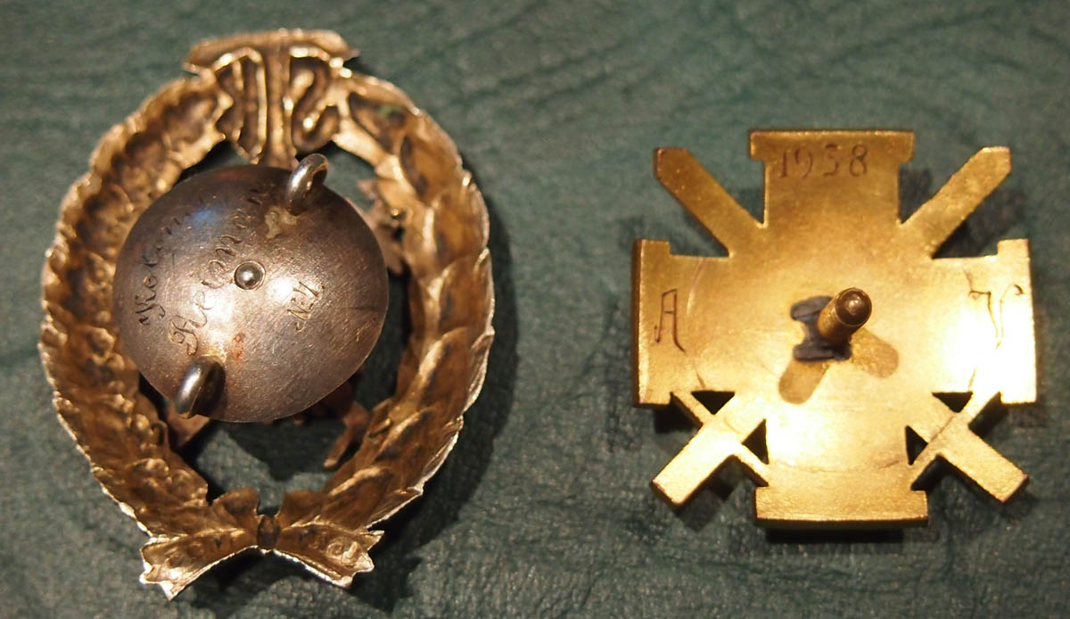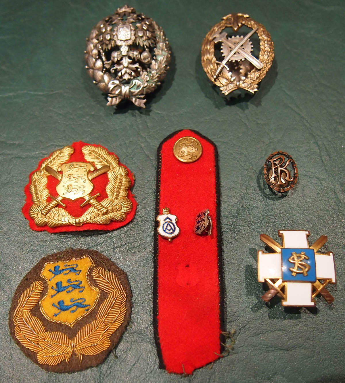 Selle nädala leiud! Huvitav komplekt on kolonel Reimanni (1932.aastast kindral - major) tsaariaegne Kindralstaabi Akadeemia ja Sõjaväe Tehnikakooli I lennu märk, millelele graveeritud nimi ja nr.7. Seda varianti pole ka raamatus, analoogne on Laidoneri muuseumis, mis kingitud ülemjuhatajale I lennu lõpetajate poolt. Seega telliti I lennu märki 2 partiid - üks lõpetajatele ja teine kingituseks õppejõududele ja lektoritele. Lisaks veel komplekt vormielemente ja Sõjakooli lõpumärk kus tagaküljele graveeritud aastaarv 1938 ja nimetähed A.V. Ning kõigele lisaks veel Politseikooli alama klassi lõpumärgi miniatuur.