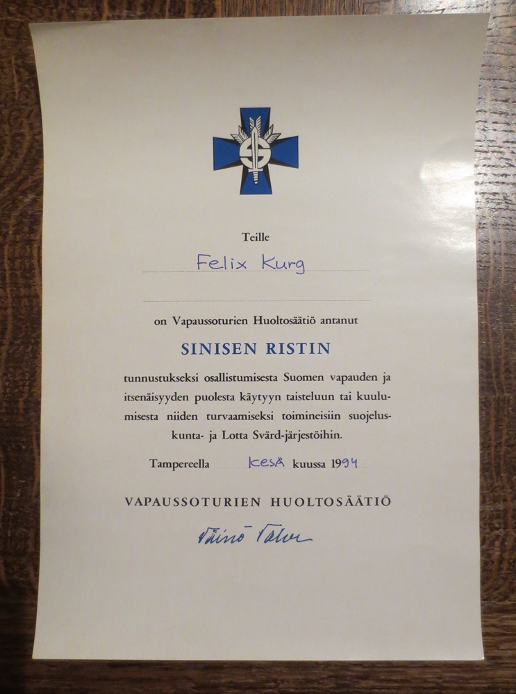 Tegelikult see sinise risti teema on väheke kummaline sest rist peaks olema sõjaaegne ja Soome kaitseliidu oma.Mees aga teenis kaitseväes.