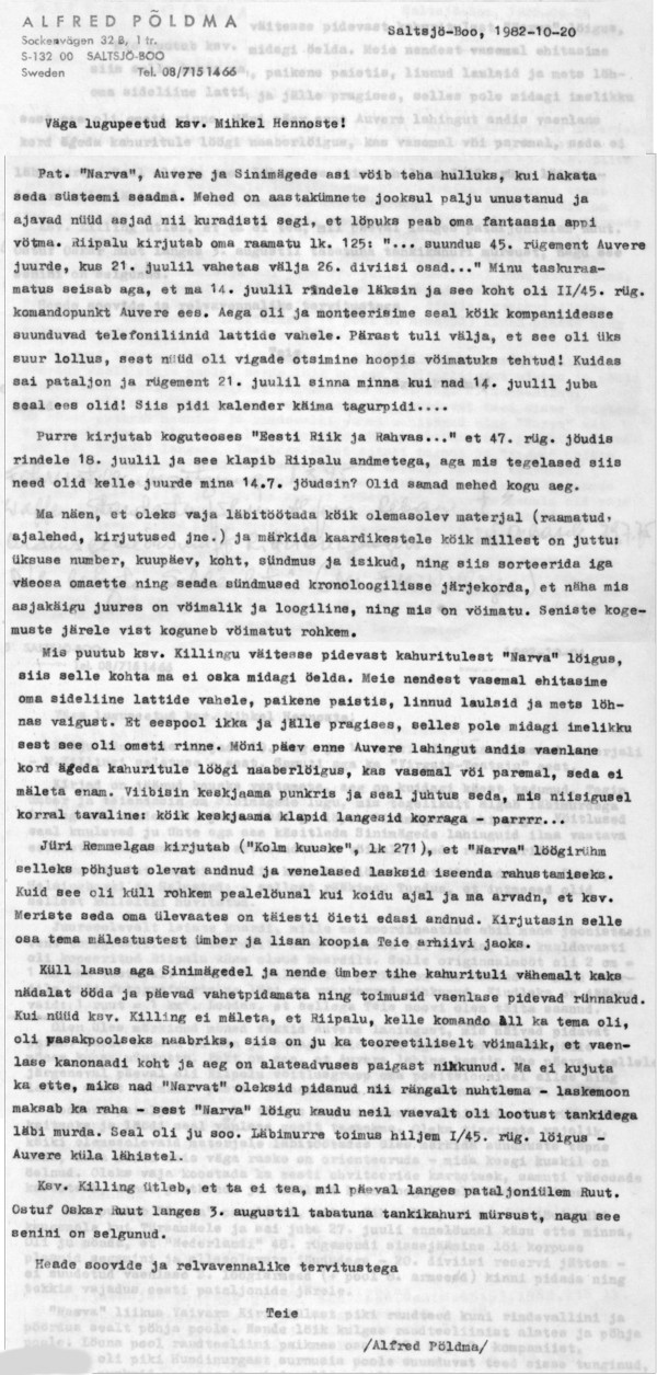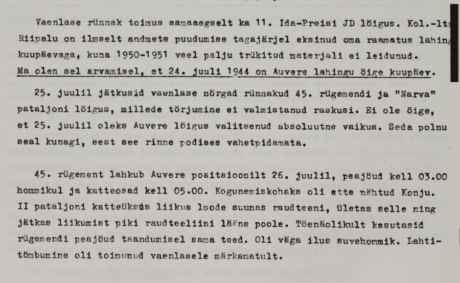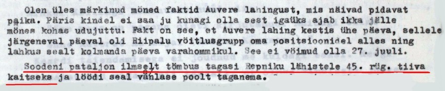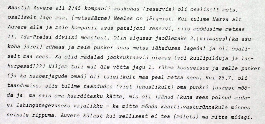Sain seda läkitust lugeda 1/45 Rgt. lahingstaabis Maitla punkris kui mind sinna kutsuti uute ülesannete täitmiseks. Olen lähetatud 4. kp. juurde Joala ja Kopli rühma poistega Auvere tee kaitseks. Seda teed Auvere jaamani ei tohi lasta vaenlase valdusse. Kui nad siit tankidega läbi murravad, võivad nad 4 km eemal merelaheni välja jõuda ja riivistada kogu Narva rinde ja kotti ajada Narva jõel võitlevad diviisid.