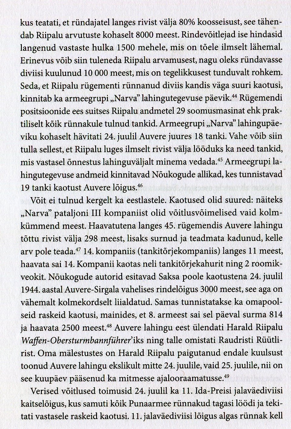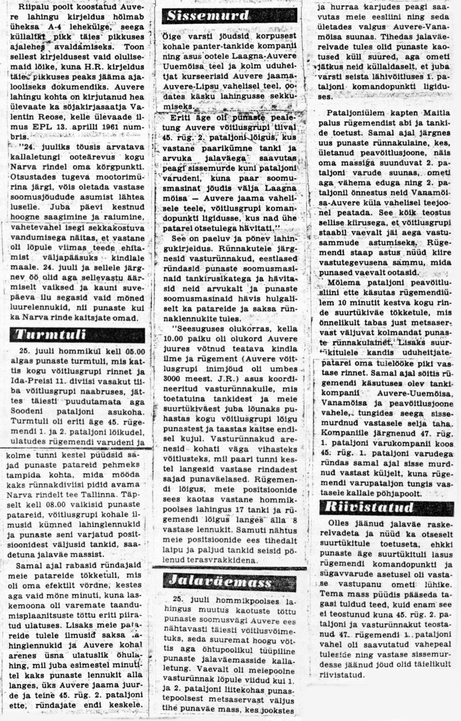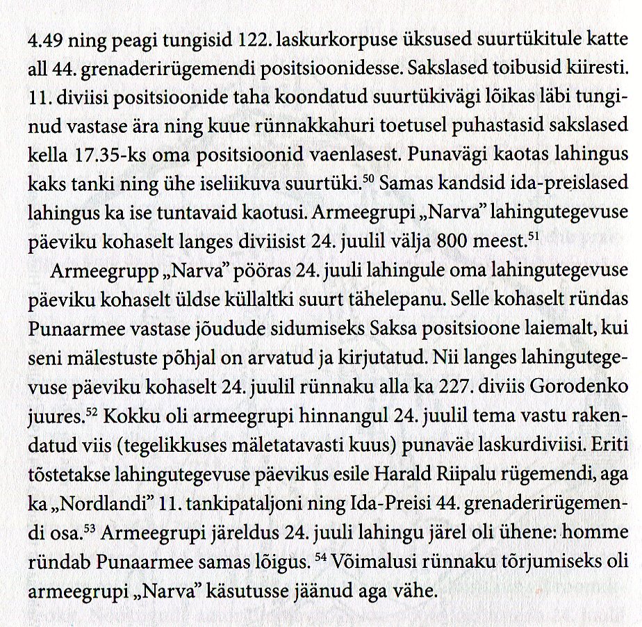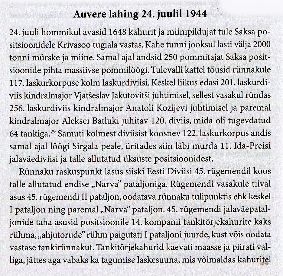 Uued pommid ja mürsud raksatasid punalaviini. Purukslastud tankid pahis-tasid Auvere maanteel. Nüüd seda kirjutades on see kui ennemuistne unenägu. Sinna teeveerele jäi 17 tanki suitsema. Meie ette kuhjus 2000 - 3000 venelase elutut keha. 24. juulil kindral Maslennikov, Eremenko üksused 80 diviisi tugevu¬sega üritasid Irboska, Narva rindel meie maad vallutada - meid ründavast diviisist ei jäänud palju järele.