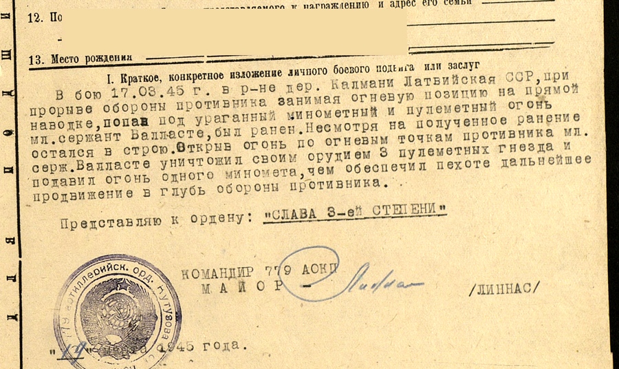 Laskurkorpuse suurtükiväelase Aksel Vallaste autasud. Kahjuks on ordeniraamat kadunud ja alles vaid hiline sõjaväepilet, kuid autasud on tema omad. Kuulsuse III klassi ordeni number on 464 970. Punatäht on saadud Suure ja Väikese väina forsseerimisel tehtud vaprate tegude eest, Kuulsuse orden on saadud Kalmani küla lahingutes Läti NSV-s.