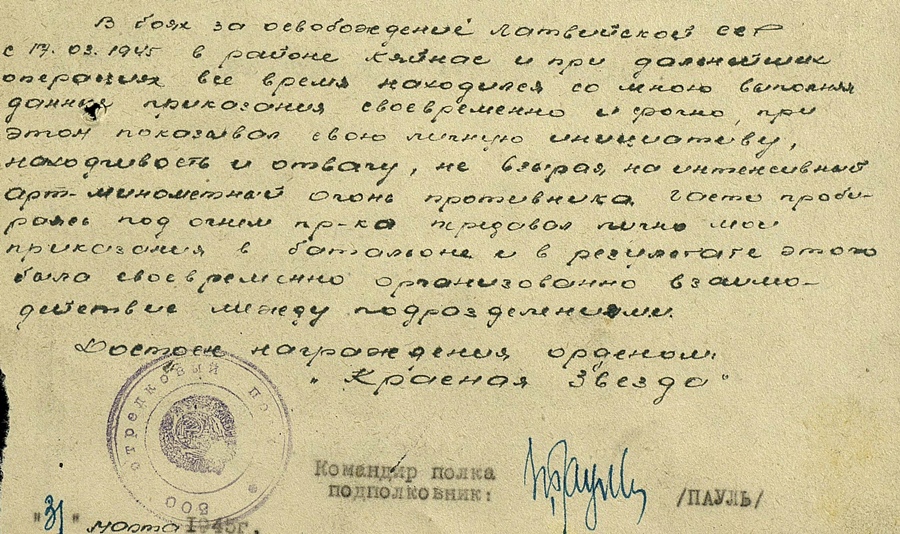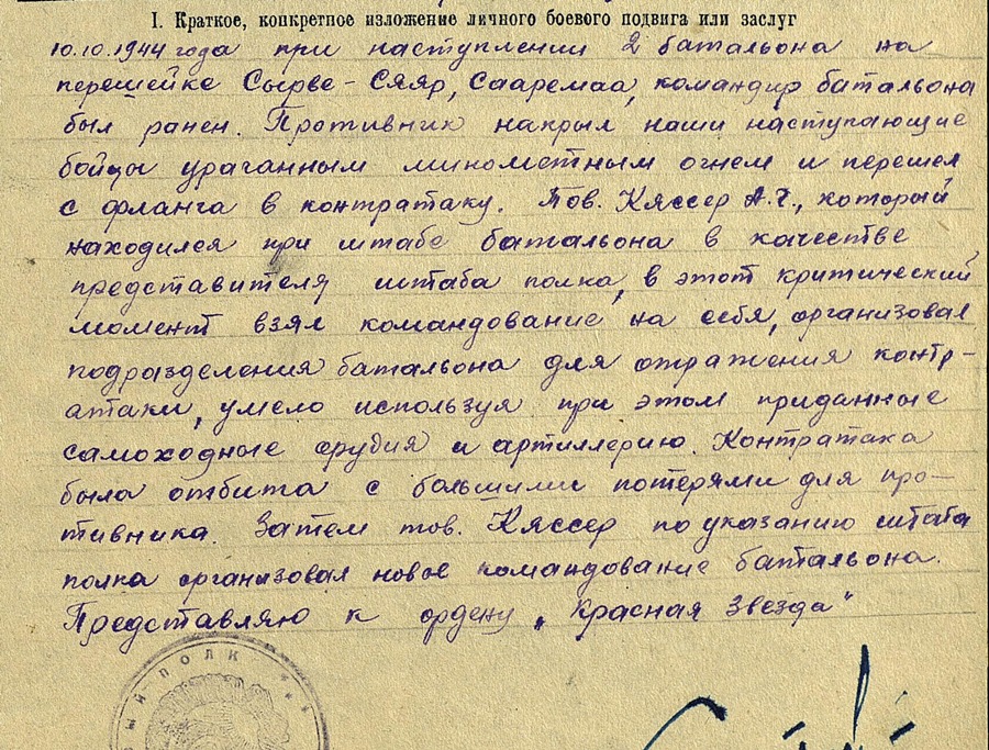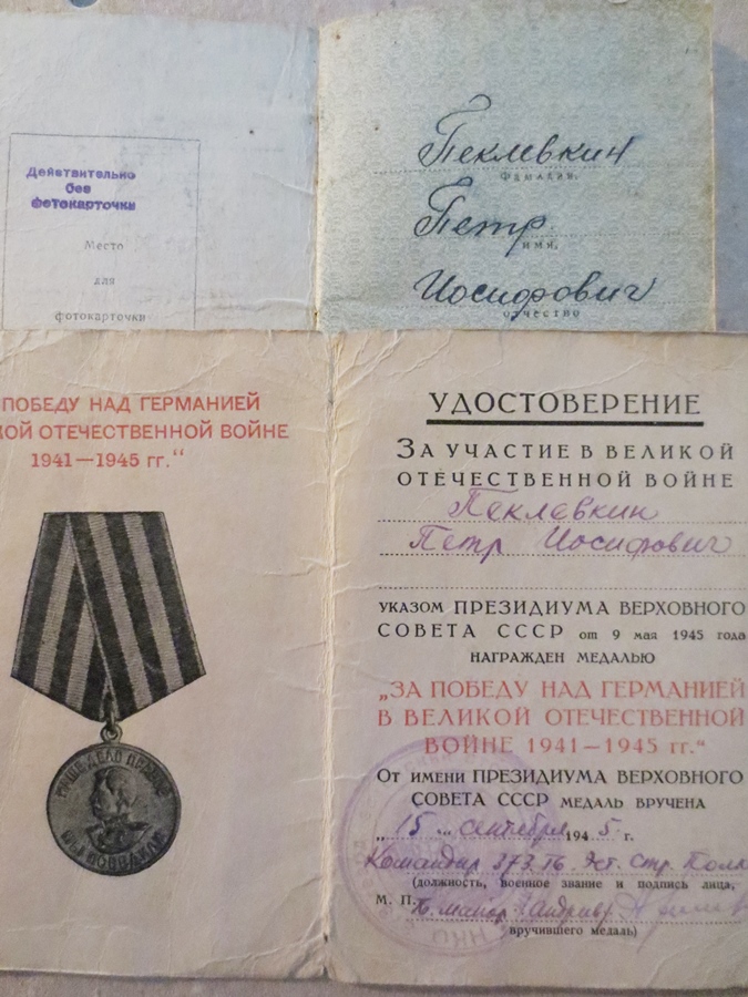 Eesti Laskurkorpuse 373. Laskurpolgu kuulipildujaroodu komandöri Peeter Peklevkin. Sai Punatähe ordeni ja seda Emajõe forsseerimisel, kus väikese grupi oma pataljoni võitlejatega ületas Emajõe, tappis isiklikult 4 sakslast, lõikasid ära tee ja hävitasid 2 vaenlase veokit.