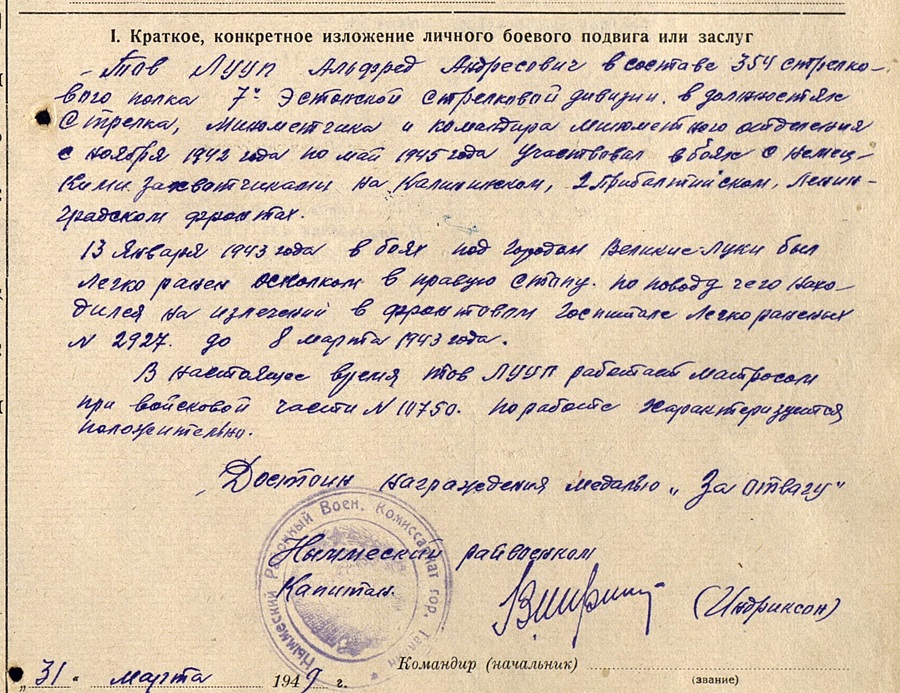 võttis osa Velikije Luki, Eesti ja Kuramaa lahingutest.