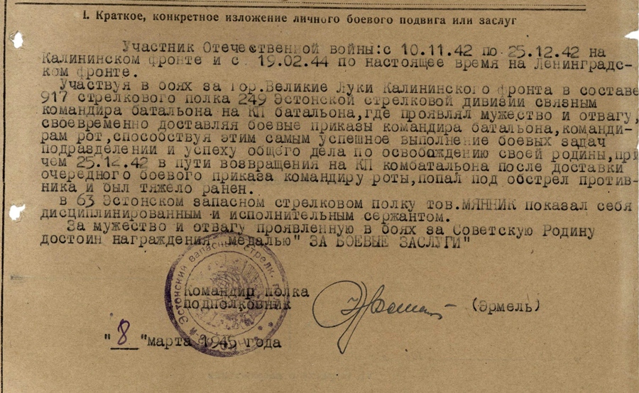 Medal määrati mehele Velikije Luki lahingute eest.