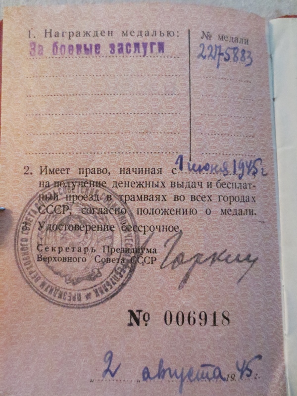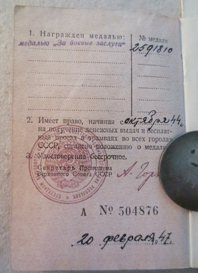 Medal on saadud haavatasaamise eest Velikije-Luki lahingutes.