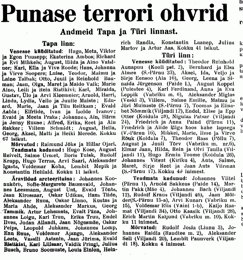 "/.../ Türi saatejaama ülem oli sakslane Schnellewald. Personali hulka kuulusid poliittöötajad Grabers ja Wunschkun, saatetehnikud Herbert Vessar, Voldemar Kivisepp ja Ants Kajandi, valveametnikus Arvi Sidron, Johannes Mikkola ja õpilane Järv/.../"