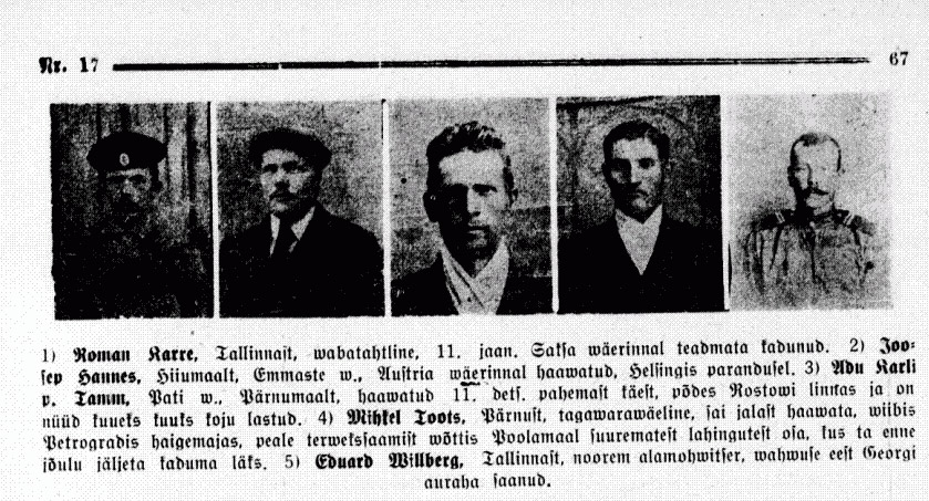 Esimene mees on Roman Karre, Tallinnas, wabatahtline, 11. jaan. Saksa wäerinnal teadmata kadunud.