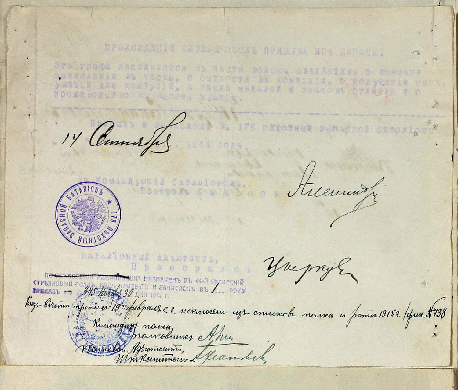 14. septembril 1914. arvatud 178 jalaväe tagavarapataljoni koosseisu.