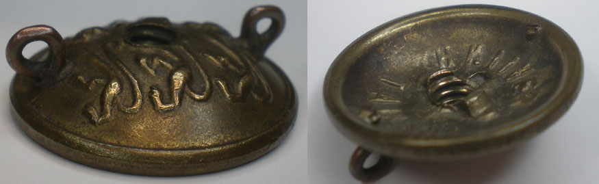 Mutri kõrvade jaoks on puuritud augud nööbi servadesse ja need sealt läbi pistetud ning kinni joodetud (väga korralik töö).
