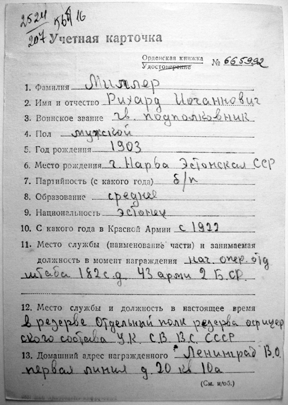Miller oli Punaarmee ridades 1922. a. Huvitav, et parteisse ei astunudki. Sõjast võttis osa päris kõrgetel ametikohtadel, näiteks Punalipu või siis Isamaasõja ordeniga autasustamise ajal oli ta 2. Valgevene rinde 43. Armee 182. Laskurdiviisi operatiivosakonna ülem. Isikliku kaardi lisan ka ja autasustamislehed on tellitud, eks siis näis mille huvitava eest Miller autasud sai.