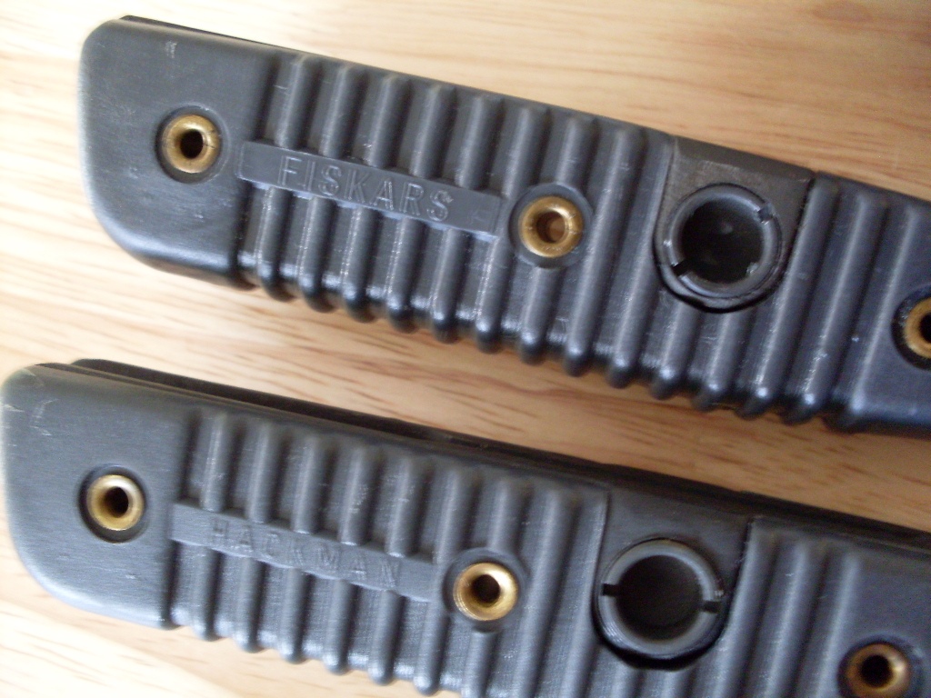 Väikesi omavahelisi erinevusi on ka - HACKMANi tupp on rohekam ja FISKARSil hallikam (ka on tupe materjal firmadel pisut erinev); FISKARSi tera tundub paar mm pikem; mõningane erinevus on ka terade geomeetrias.