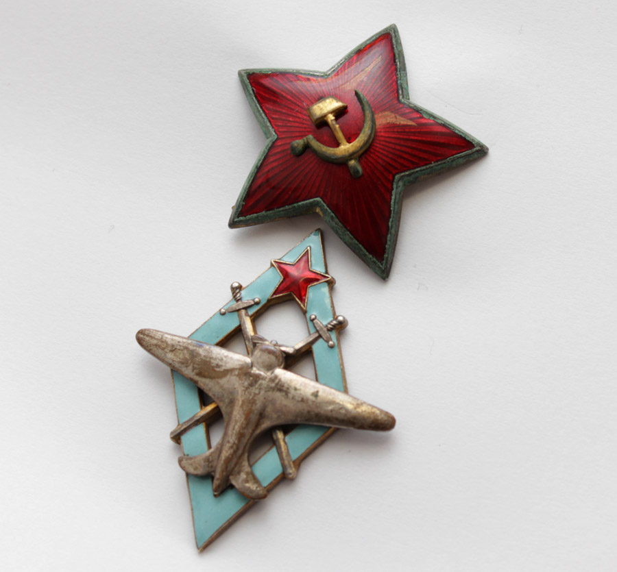 Komplektiks on seda natuke palju nimetada aga siin on tema sõjaaegne mütsimärk ja sõjalennuväe kooli piloodi rinnamärk.