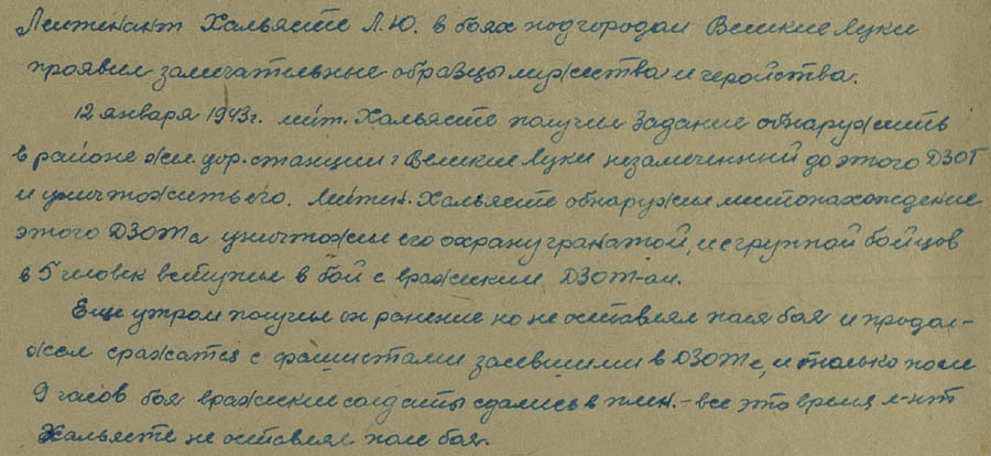 Kuna andmebaasist tema II järgu Isamaasõja autasustamislehte ei leidnud siis lappasin natuke raamatuid. Teoses "Eesti rahvas Suures Isamaasõjas" II osa lk. 549 on selline lõik: "Ägedate lahingutega jõudsid raudteele välja ka 925. laskurpolgu allüksused. Vaenlase soomusrongiga astus kahevõitlusse seersant Ernst Joosti kahur. Soomusrong sai mitu otsetabamust, kaks platvormi süttisid. Leeke, suitsu ja aurupilvi välja paisates hakkas soomusrong aeglaselt taganema. Järjekordse rünnakuga hõivati raudteetamm. Sapöörid leitnant Lembit Haljaste juhtimisel õhkisid ja lammutasid vaenlase tule all osa rööbasteest, et takistada rongi taasilmumist polgu vasakule tiivale. Sealjuures sai L. Haljaste mitmel korral haavata, kuid võitlusväljalt enne ülesande täitmist ei lahkunud.".