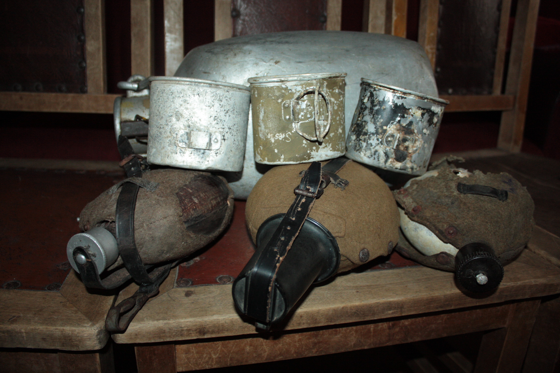 1) pudel OLHM37, kork ja rihmad CFL37, vildi markeeringust raske aru saada, aasta igal juhul 38. Tundub, et juba sõja ajal erinevatest detailidest kokku pandud, sest pudelipõhjal ja vildil on samad vigastused. Korgile kraabitud nimi M. Burckhardi