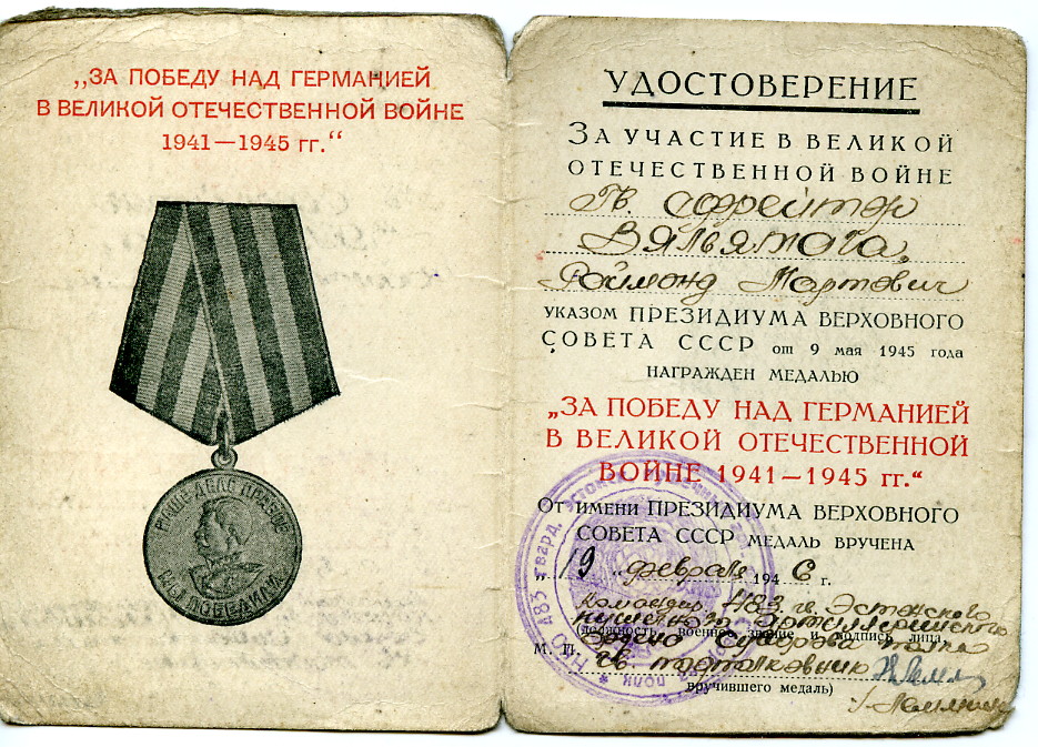 tossom kirjutas:483. suurtükiväepolgu jefreitor Raimond Väljataga. Vapruse medali ( mille sai Kuramaal ) kavaler, kahjuks medalit ennast ei ole. Küll on aga alles medal XXX aastat armeed ja rinnamärk tubli autojuht.