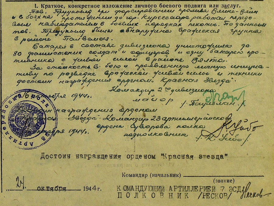 925. Laskurpolk, vanem Boris Kozlov. Vapruse medali nr. 3442417 kavaler, sai Sõrve sääre lahingutes 1944 aasta Septembris raskelt haavata.