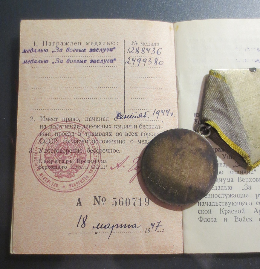 Esimene Punatähe orden (1147049) on saadud Väikese väina forsseerimise eest, teine Punatäht ja Lahinguteenete medal arvatavasti Punaarmees väljateenitud aastate eest.
