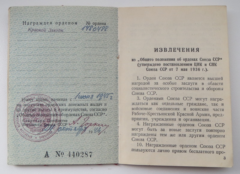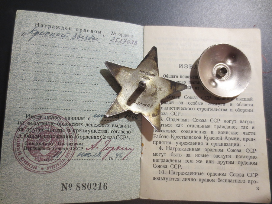 Numbri järgi paigutaksin Isamaasõja ordeni Emajõe lahingute perioodi, 1944. aasta septembrisse. Kaasa tulnud info kohaselt võiks seostada 7. laskurdiviisi 354. laskurpolgus teeninud Nikolai Karmu nimelise vanemleitnandiga aga tema sai oma Isamaasõja ordeni hoopis 1945. aasta märtsis Kuramaa lahingute eest. Punatähe ordeni number on üle 3 miljoni aga andmebaasi sisestatud andmete järgi sai Nikolai Karmu Punatähe Emajõe lahingute eest. Kuni dokumente pole üles leitud või Venemaalt numbri järgi kindlaid andmeid tellitud siis 100% kindlalt ei saa väita, et tegemist just N. Karmu autasudega. Kindlasti on aga autasude komplekt kuulunud Eesti laskurkorpuse sõdurile/komandörile.