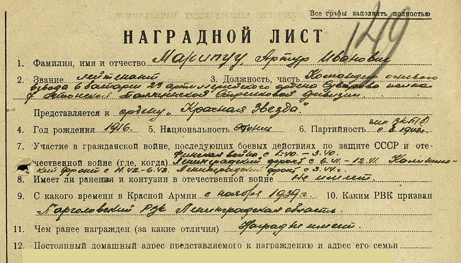 Ilus komplekt! Vaata, näiteks väga lähedaste numbritega autasud on leheküljel 9. Kapten Tsuhnenkov, 7. Eesti Laskurdiviisi 354. Laskurpolgu miinipildujate roodu komandör.