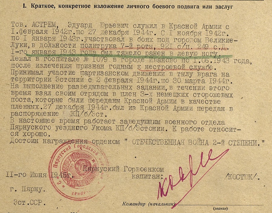 No ja lisame ka sellise mehe, nagu vanemleitnant Eduard ASTREM. 921. Laskurpolk. 1943-ndal aastal sai Velikije- Luki lahingutes jalga haavata, mille järel oli Ivanovo linnas haiglas. Pärast, kui ta riviteenistuseks kõlbmatuks tunnistati läheb asi huvitavamaks…
