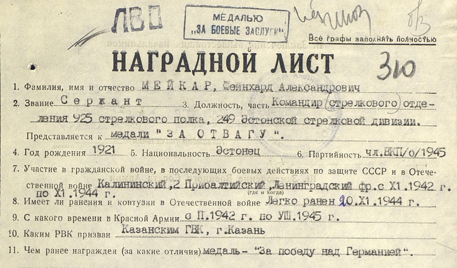Ja veel üks ostast läbi käinud seersant. Feinhard Meikar, Lahinguteenete medali kavaler. 249. Laskurdiviis 925. Laskurpolk. Leningradi rinne- Velikije Luki- Narva- Saaremaa. Medal on saadud haavatasaamise eest Saaremaal 1944. aastal. Vahetult pärast sõda töötas Saaremaal, Mustjala vallas miilitsana ja muuhulgas võttis aktiivselt osa ka bandiitide vastasest võitlusest, mida iganes see siis ka tähendas.
