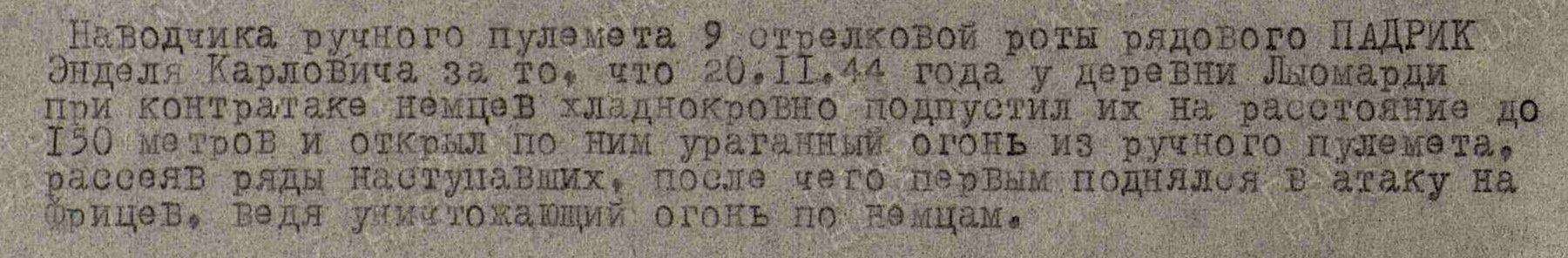 Eesti laskurkorpuse 249. laskurdiviisi võitleja Endel Padrik sai oma Vapruse medali Sõrve lõpulahingute eest, kus ta 20.11.1944 Lõu küla juures (ametlikus dokumendis Lõumardi küla aga sellise nimega küla ma ei leidnud), kus ta kergekuulipildujaga avas marulise tule ja lõi tagasi sakslaste vasturünnaku ning seejärel tõusis esimesena rünnakule.