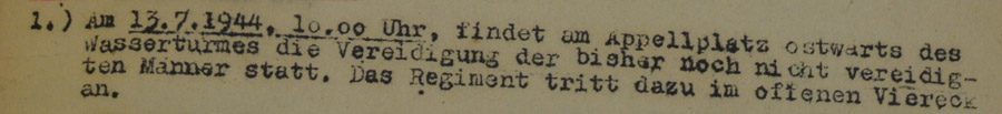 Enne lahkumist, kui olime kasarmute ette rivistunud, andis pataljoniülem (riigisakslane) käskluse: „Reichsdeutsche vertreten!” Pataljoni ette astus kolm kuni viis Unterscharführer n. Meie rühmas oli üks austerlane, tema polnud Reichsdeutsche. Küll oli aga meie kompanii teises rühmas üks küllaltki tõbras Unterscharführer, kes ette astus. Siis anti meile käsklus: „Vasak pool!” ja pataljon läks manöövritele. Marssisime ja kaevusime, ründasime ja paugutasime. Ühe öö magasime metsas, teise põllukraavis. Sõjamäng oli korralik.
